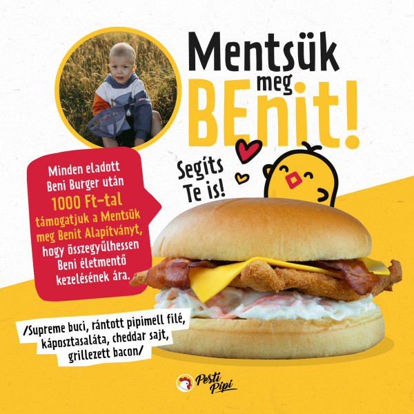 Micskó Benjámin 4 éves kisfiú, akinek fél éve Duchenne-féle izomsorvadást diagnosztizáltak, ami azt jelenti, hogy az izmai folyamatosan sorvadnak. Amerikában elérhető egy génterápia 1,3 milliárd Ft-ért, ami megmentheti Beni Életét. Minden Beni Burger után a Pesti Pipi 1000Ft-tal támogatja a Mentsük meg Benit Alapítványt, hogy minél hamarabb megkaphassa az életmentő kezelést!❤️☀️