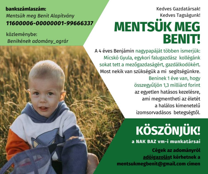 ???? Micskó Gyula BARÁTUNK, GAZDATÁRSUNK, EGYKORI FALUGAZDÁSZUNK családját a sors szinte lehetetlen helyzet elé állította: ????kis unokája, a 4 éves Beni a Duchenne-féle izomsorvadásos betegséggel küzd, és mindössze 1-1,5 éve maradt arra, hogy megkapja a világ második legdrágább,1,3 milliárd forintba kerülő gyógyszerét. Ezt az összeget előteremteni egy család sem tudná,❗️❗️☝️ de több ezer, százezer ember összefogásával sikerülhet. ???? Mentsük meg Benit attól, hogy 10 éves korára kerekesszékbe kerüljön, és cáfoljuk meg a betegség 26 éves átlagéletkorra vonatkozó statisztikáját! Sokan együtt tehetünk azért, hogy Beninek hosszú, szép élete legyen.